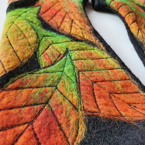 Na tle głębokiej, eleganckiej czerni wełny rozkwita prawdziwa jesienna feeria barw. Ręcznie wykonany motyw liści – mieniący się odcieniami soczystej zieleni, przez ciepły pomarańcz, aż po rdzawą czerwień – został naniesiony z niezwykłą precyzją (technika filcowania). Każdy listek wygląda jak namalowany, tworząc niepowtarzalną kompozycję.
