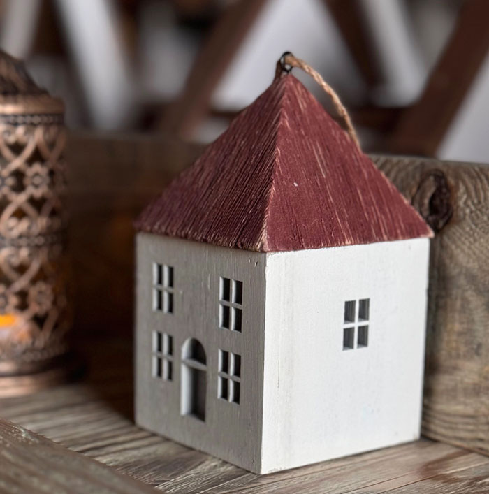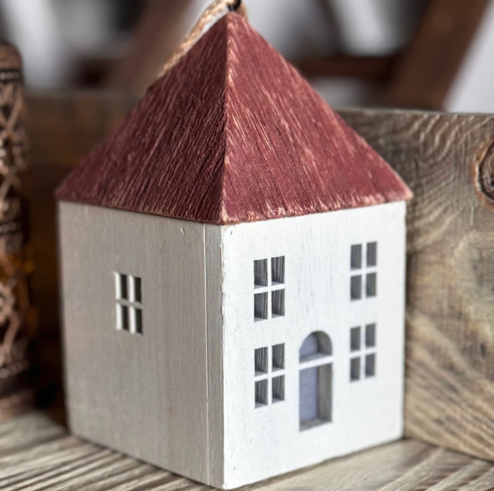Kolor domku biały z brązowym, spiczastym dachem. Lekko przecierany.