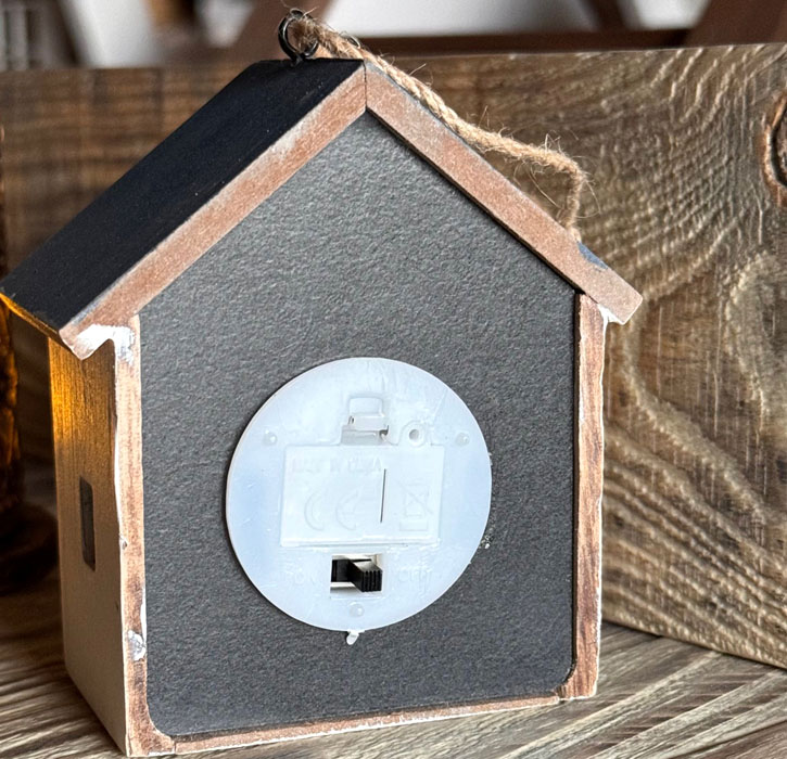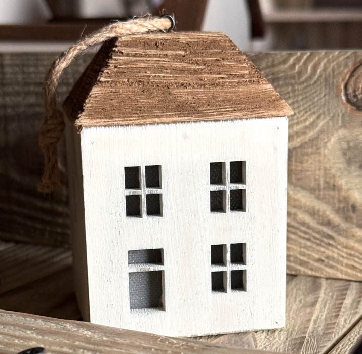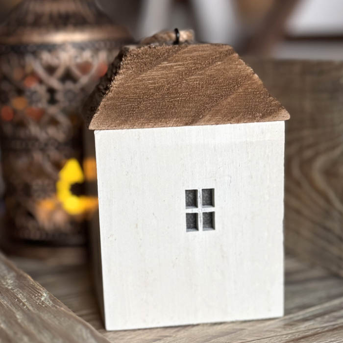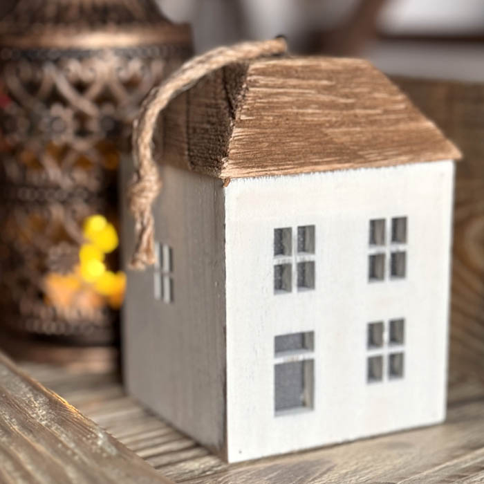 Kolor domku biały z brązowym, ściętym dachem. Lekko przecierany.