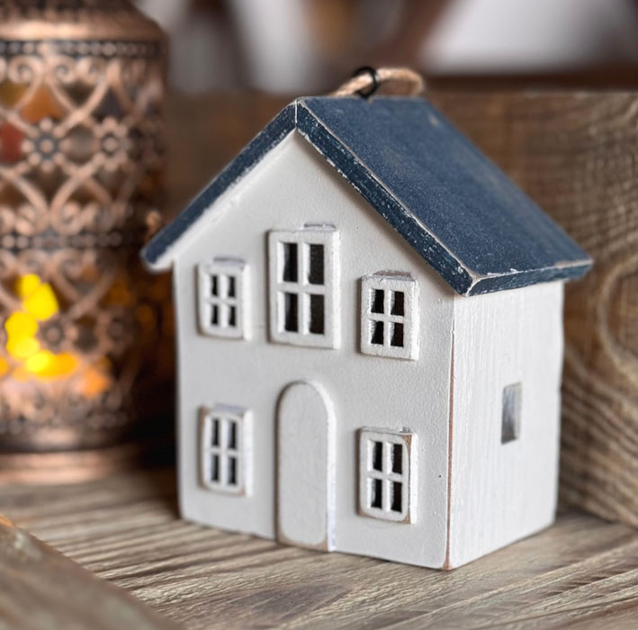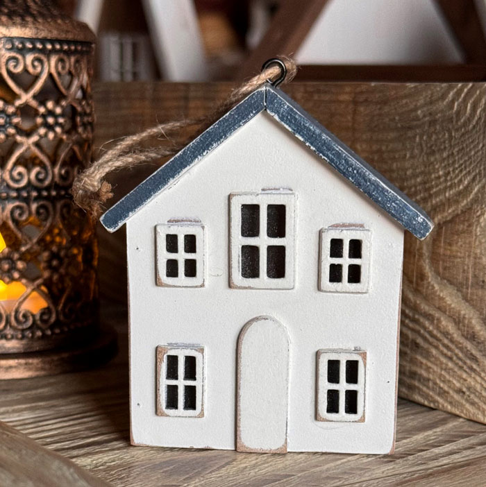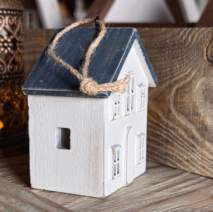 Kolor domku biały z granatowym dachem. Lekko przecierany.
