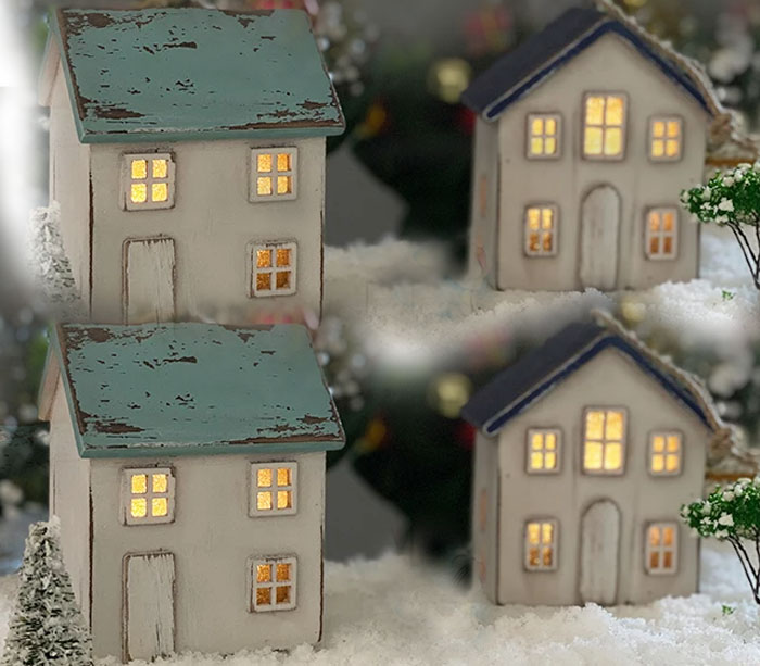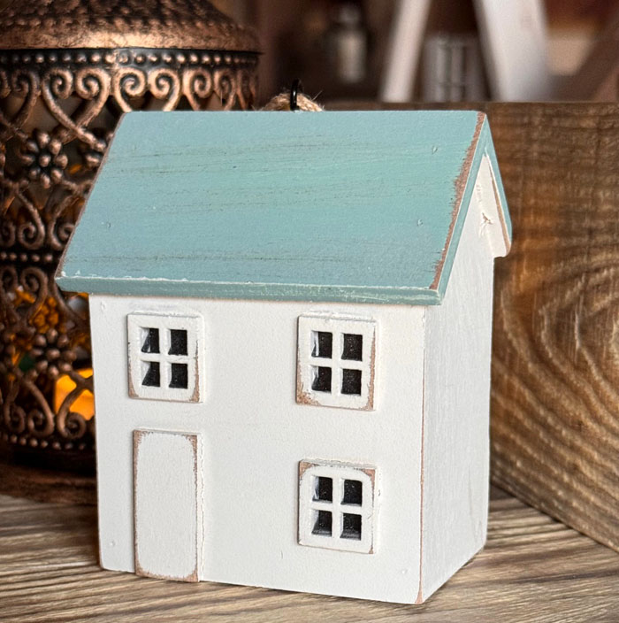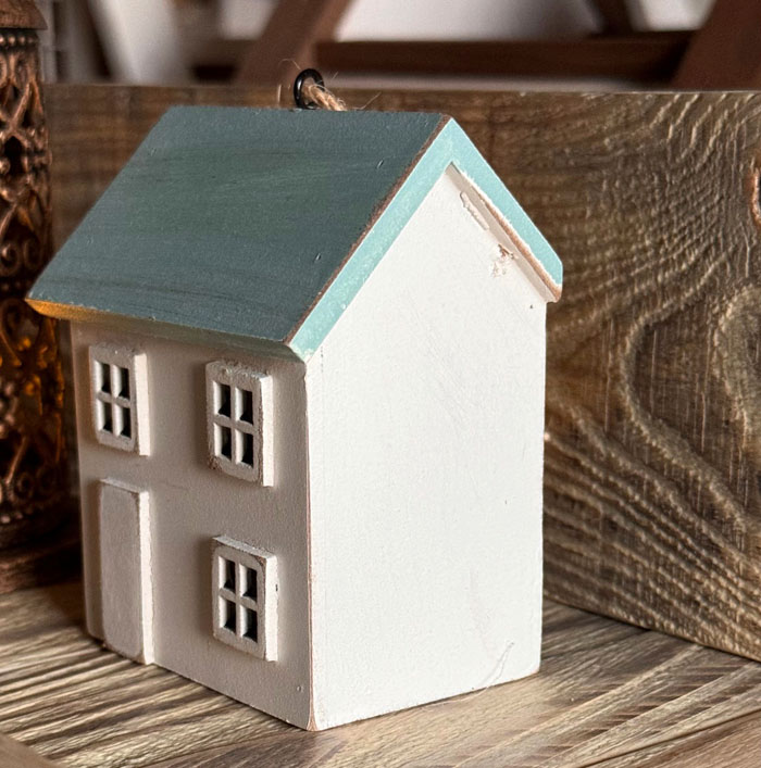 Kolor domku biały z szaro niebieskim dachem. Lekko przecierany.