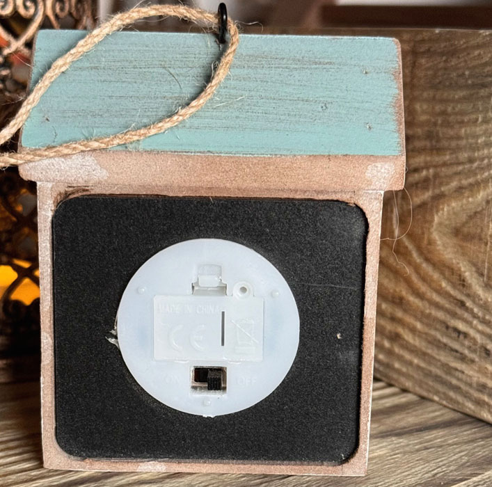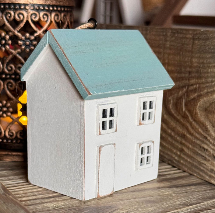Urocza dekoracja, lampion w formie domku drewnianego piętrowego ze sznureczkiem do powieszenia.