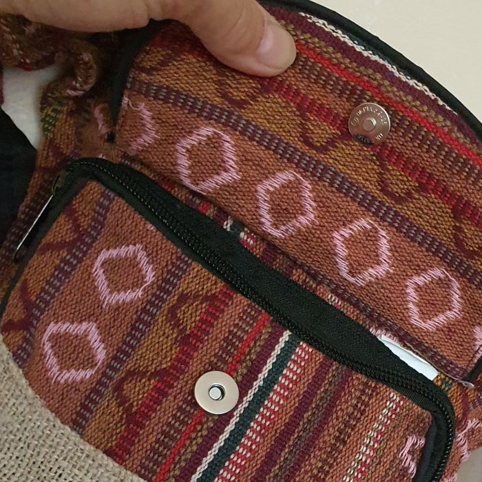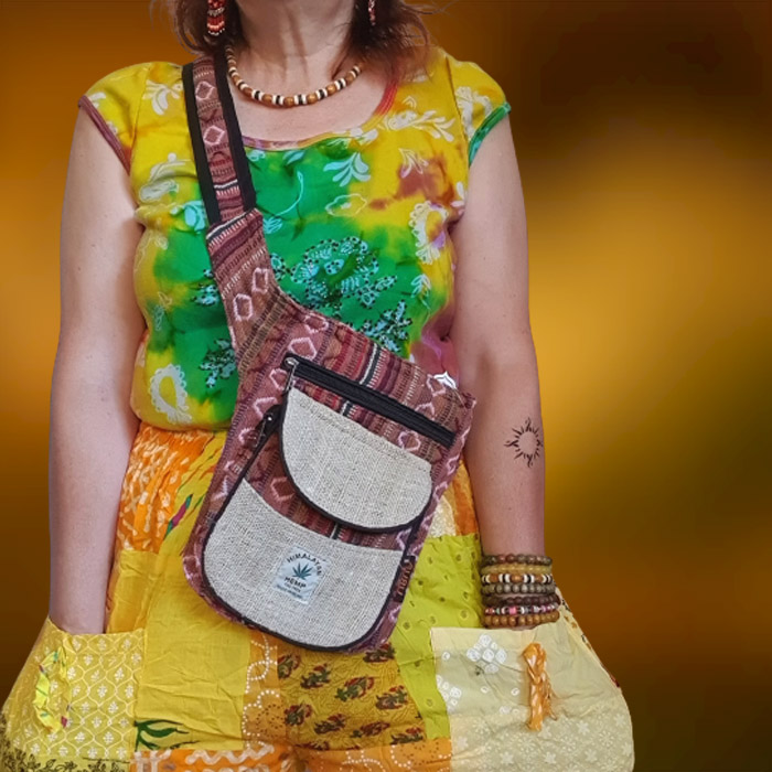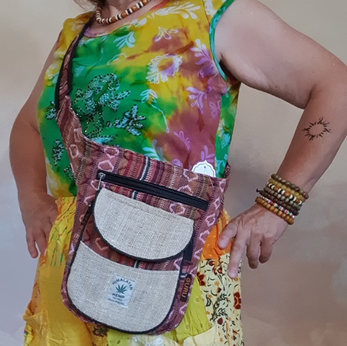 Praktyczna duża nerka konopna z trzema kieszeniami na suwak, dwie z przodu nerki, jedna z tyłu.